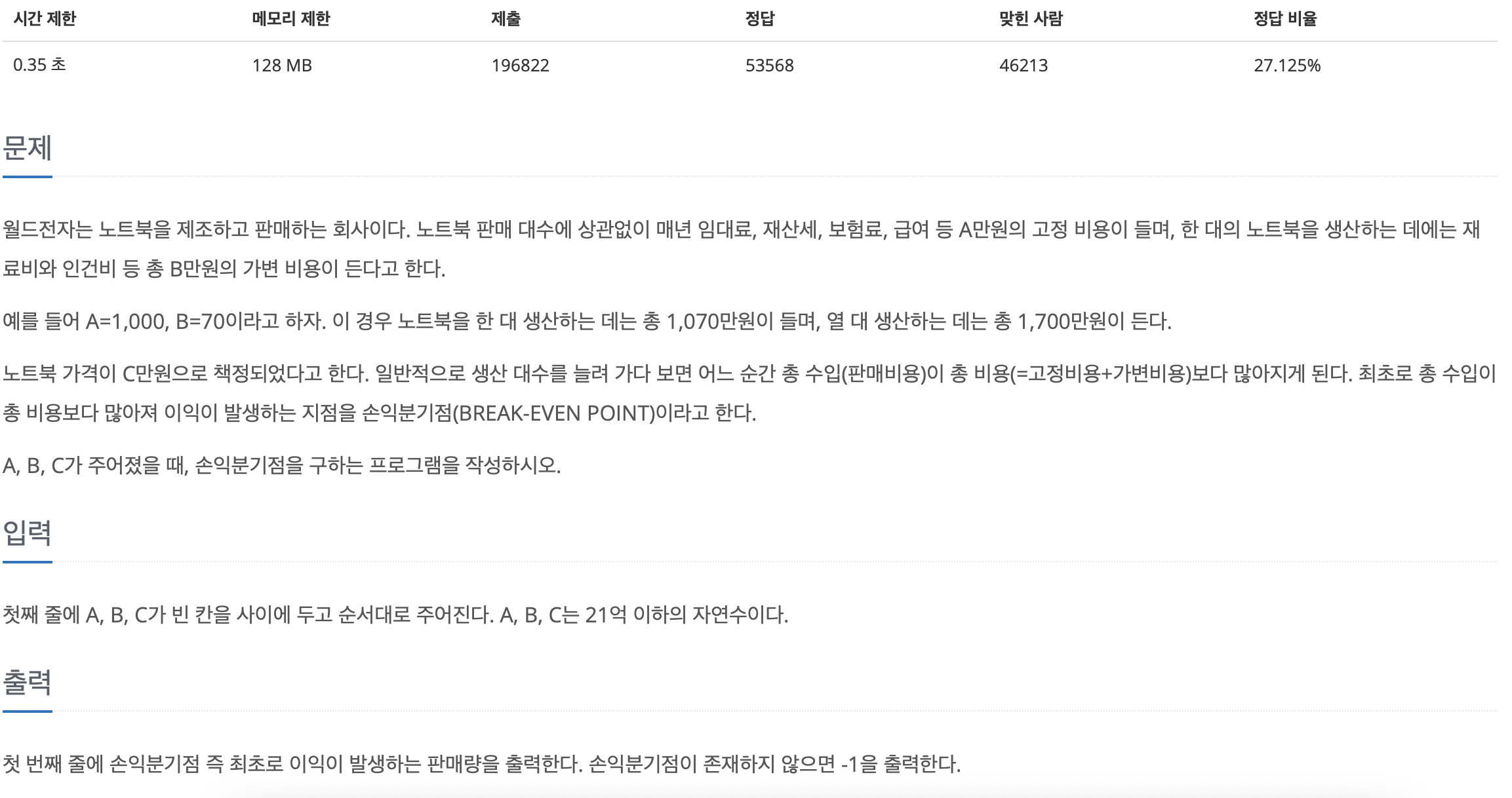 손익분기점에 도달할 수 없는 상황을 생각하지 못했고, 쓸데없는 반복문을 통해 시간초과를 달성한 말도안되는 반복문+조건문의 조합.
