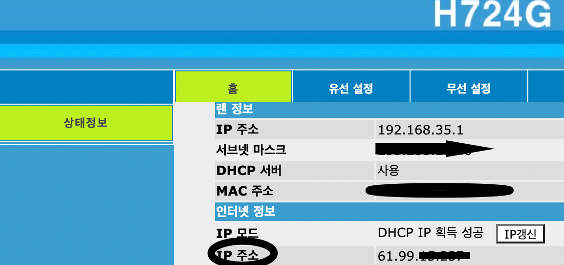 상단의 IP 주소: 내부 IP, 하단의 IP 주소: 외부 IP