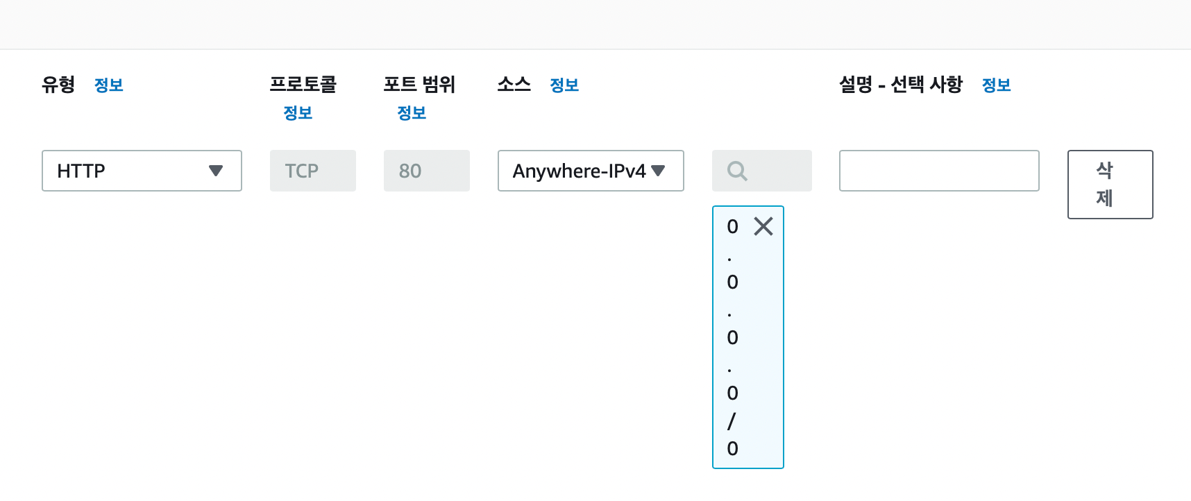 인바운드 규칙 추가를 누르고 유형 → HTTP 소스 → Anywhere-IPv4 추가